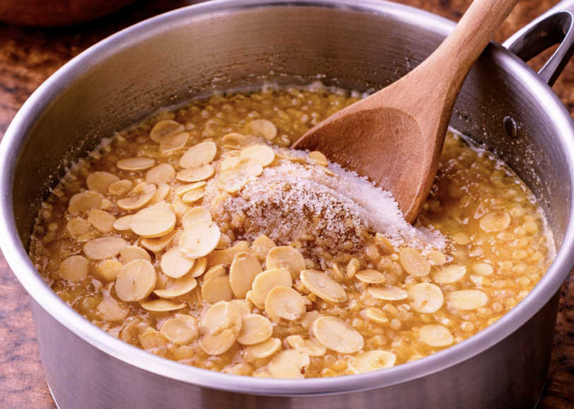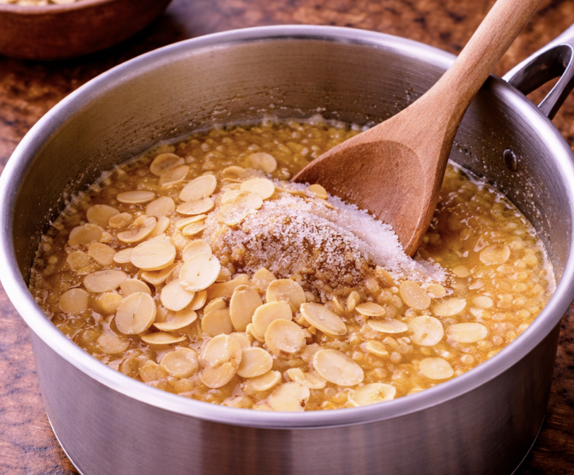 Mandeln einrühren Die gehobelten Mandeln und Vanillezucker in die warme Masse geben und gut vermengen.